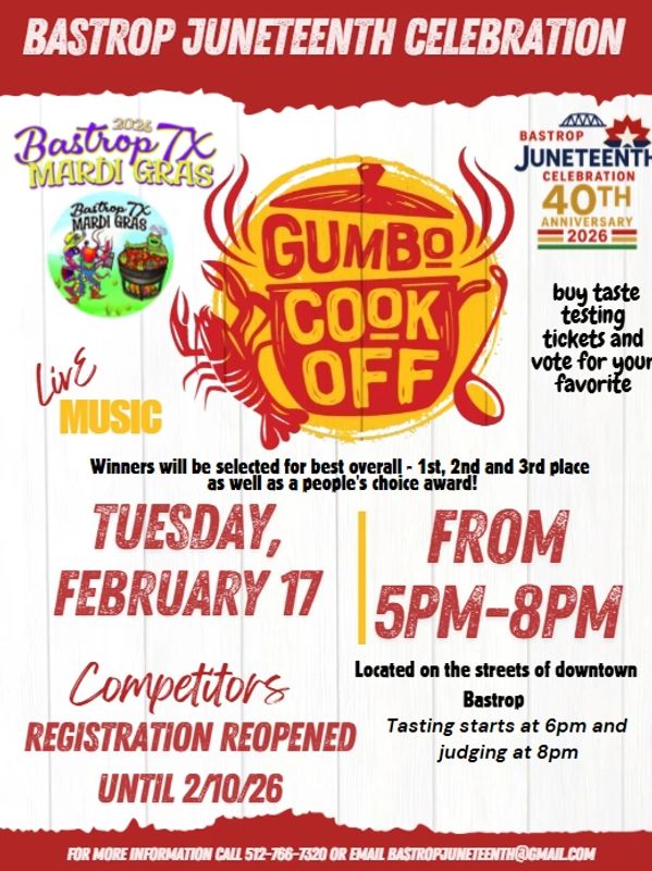 Bastrop Juneteenth Gumbo Cook-Off has been rescheduled and will take place on Tuesday, February 17th, 2026. This Gumbo Cook-Off is part of the City of Bastrop Annual Mardi Gras Festival and proceeds go to our annual scholarship and future celebrations. There will be fun for the whole family!